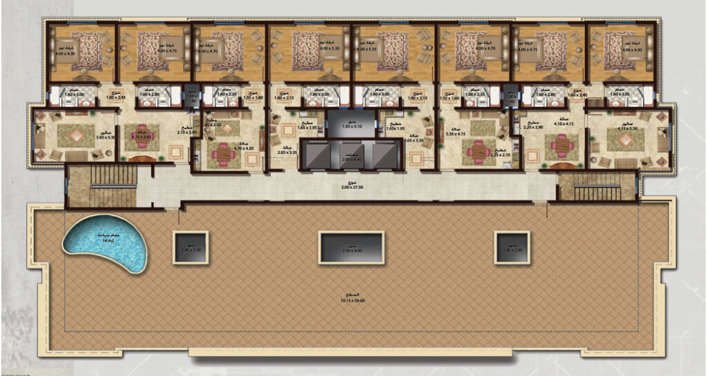 • الأدوار المتكررة (من الثالث إلى الثامن): تحتوي على غرف النوم، السويتات الفندقية، والممرات المصممة بعناية.