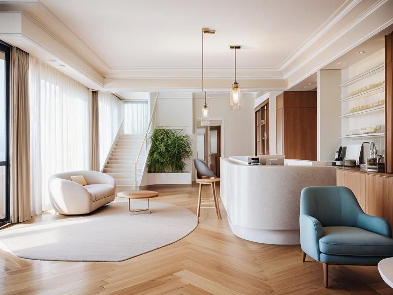 • الدور الأرضي: يضم مدخل الفندق الرئيسي، كافيه أنيق، دورات مياه للزوار، وقاعة استقبال فسيحة.